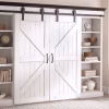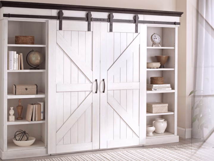 The Carriage House entertainment wall was built with mahogany and mindi solids and veneers. The sliding doors have a cross-planked design with barn door hardware. The shelves are adjustable and the center TV console has cord management for all electronic components.