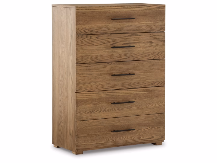 Taking an organic approach to a curated bedroom aesthetic, the warmly neutral Dakmore chest of drawers has a natural appeal. Sleek bar pulls in a blackened iron finish accentuate the drawer fronts, providing subtle contrast to the clean-lined design. With its aura of casual refinement, this piece elevates the everyday in your restful retreat.