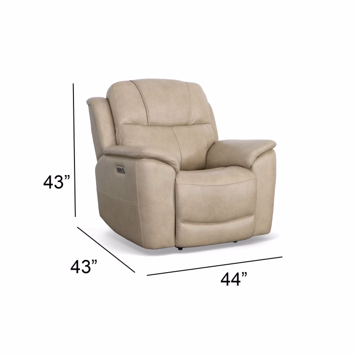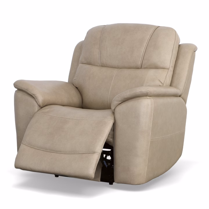 Superior ergonomics combine with the plush comfort of the Crew leather power recliner. Featuring triple power functionality that allows for independent adjustment of the headrest, lumbar support and recline, this recliner also features Zero Gravity which reduces pressure and tension on the body. Enjoy reliable comfort all day, every day, with pad-over armrests, a waterfall chaise footrest, a thin layered headrest, and divided back cushion. Built-in USB ports conveniently keep mobile devices charged and ready to stream your favorite shows. With Flexsteel’s patented Blue Steel Spring™ at the heart of the seat, and high-quality light tan leather, the Crew power recliner brings exceptional beauty and durability to your home.
