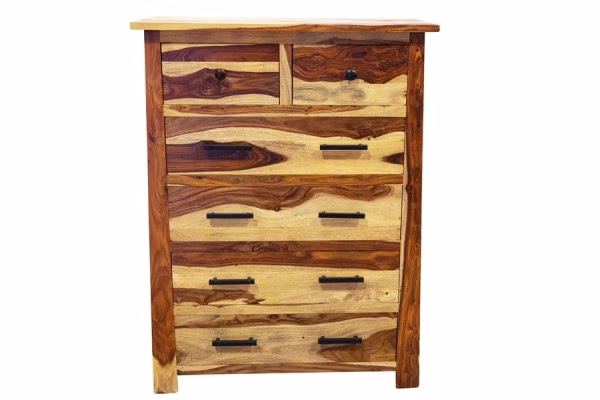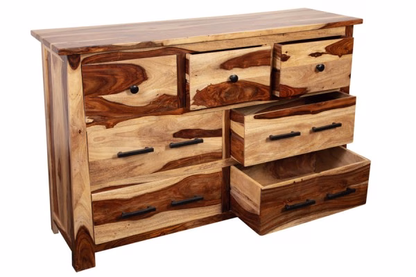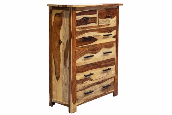 The solid wood Kalispell Collection is an homage to the American Arts & Crafts movement. Handmade in India by artisans, this collection celebrates quality craftsmanship and the beautiful, rich grain of sheesham wood. Hammered black metal hardware and tapered lines add architectural detail to this classic wood collection.