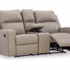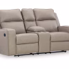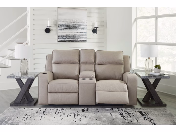 Indulge your lust for comfort and love for contemporary design with the Lavenhorne reclining loveseat. Made for easy everyday living, it’s upholstered in a heavyweight padded faux leather and accented with contrast jumbo stitching for fashion-forward flair. Sleek track arms elevate the look with a touch of modern sensibility. A padded center console with dual cup holders completes the experience.