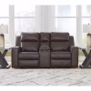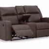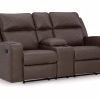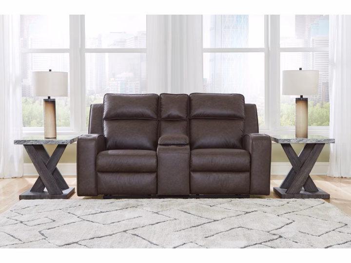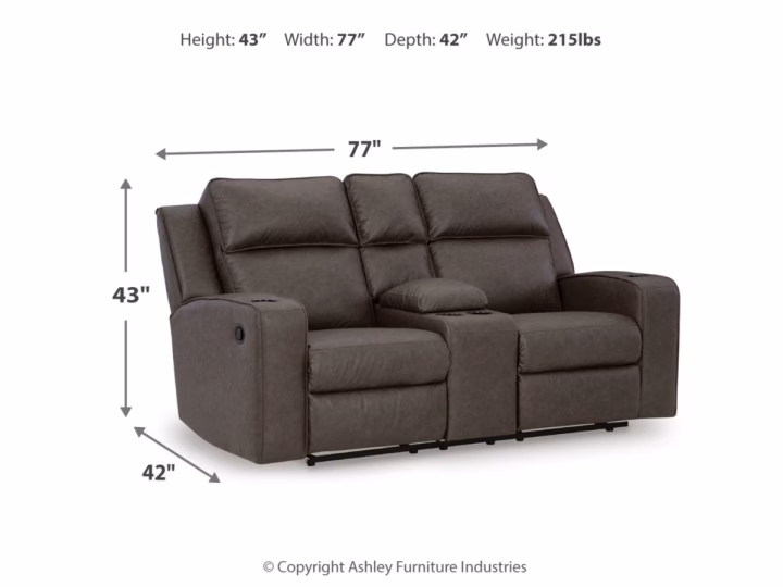 Indulge your desire for comfort and love for contemporary design with the Lavenhorne reclining sofa. Made for easy everyday living, it’s upholstered in a heavyweight padded faux leather and accented with contrast jumbo stitching for fashion-forward flair. Sleek track arms elevate the look with a touch of modern sensibility. A padded center console with dual cup holders completes the experience.