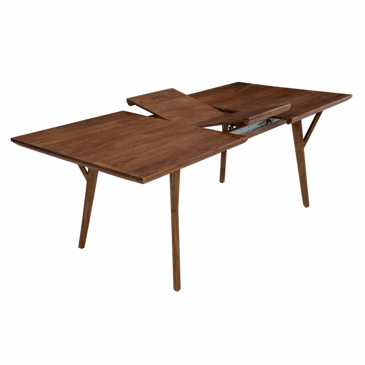 Discover the perfect blend of style, functionality, and timeless elegance with the rectangular Mid-Century Modern Dining Table. A warm cinnamon finish will complement any home décor, and exudes an inviting aura. The 18-inch self-storing butterfly leaf adds an extra layer of convenience, effortlessly extending the table to 84-inches and comfortably accommodating up to 6 guests. Tapered legs converge into a clean-lined A-frame, transforming your dining space into a haven of modern sophistication. This dining table is carefully crafted of solid mango wood, ensuring durability and longevity, so you can enjoy lively dinner parties and intimate meals for years to come.